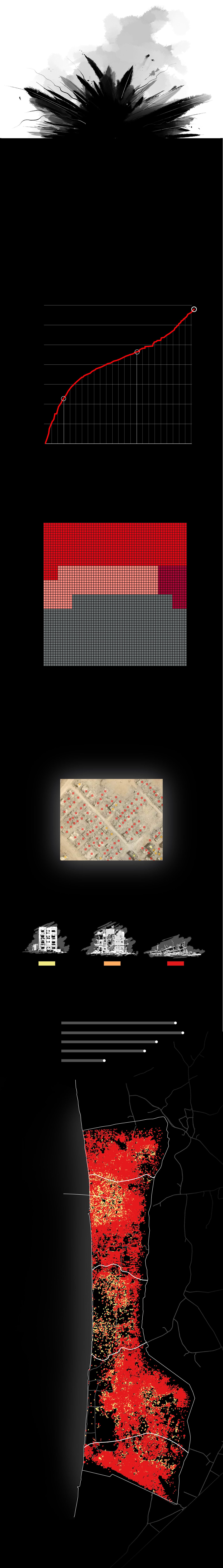 Los siguientes mapas muestran una evaluación integral basada en imágenes satelitales de los daños en las estructuras, vías de comunicación y cultivos dentro del área de la franja de Gaza. Los datos georreferenciados del UNOSAT (Centro de Satélites de la ONU) reflejan los resultados de cada edificio antes y después de las operaciones militares israelíes.